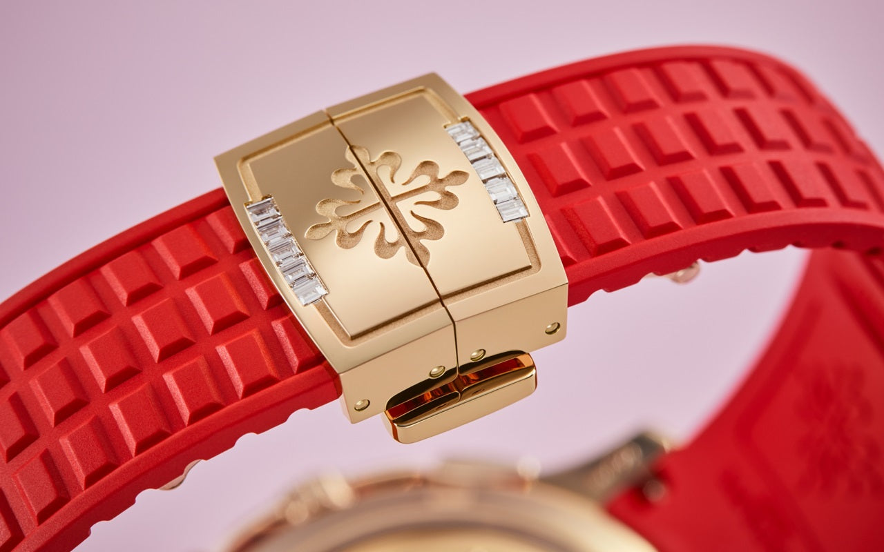 Introducing the Patek Philippe Aquanaut Luce “Rainbow” Chronograph 7968-300R-001, a dazzling embodiment of luxury and vibrant style. This exceptional women’s watch features a 39.9mm rose gold case, beautifully accentuated by a rainbow-colored array of sapphires on the bezel, creating an eye-catching display of elegance and modernity. The dial White mother-of-pearl, engraved with Aquanaut pattern, baguette multicolored sapphire hour markers and gold applied numerals. This model also introduces a new function to the Aquanaut collection: a 30-minute chronograph, enhancing its functionality with a stylish sub-dial at 6 o’clock. Driven by the caliber CH 28-520, an automatic movement renowned for its precision and reliability, this watch offers a power reserve of 45-55 hours. The sapphire crystal case back allows enthusiasts to admire the intricate mechanics of the movement, showcasing Patek Philippe’s commitment to horological excellence. The Composite material, red strap mirrors the dial’s texture and secures comfortably with a fold-over clasp, ensuring the watch remains a constant, comfortable presence on the wrist. Additionally, it boasts water resistance up to 30 meters, making it suitable for varied everyday activities.