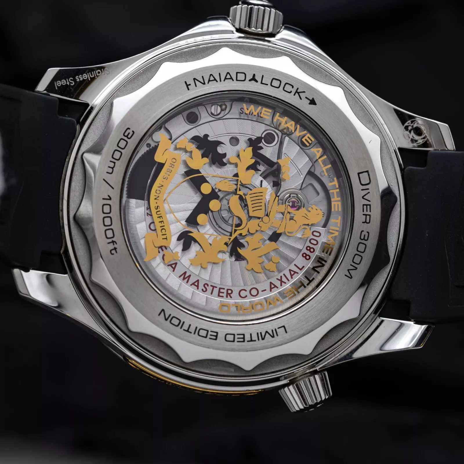 The side of the case is inlaid with a plaque in 18K gold, engraved with the number of the limited edition, which is subtly integrated with the 007 logo and is limited to 7007 pieces.