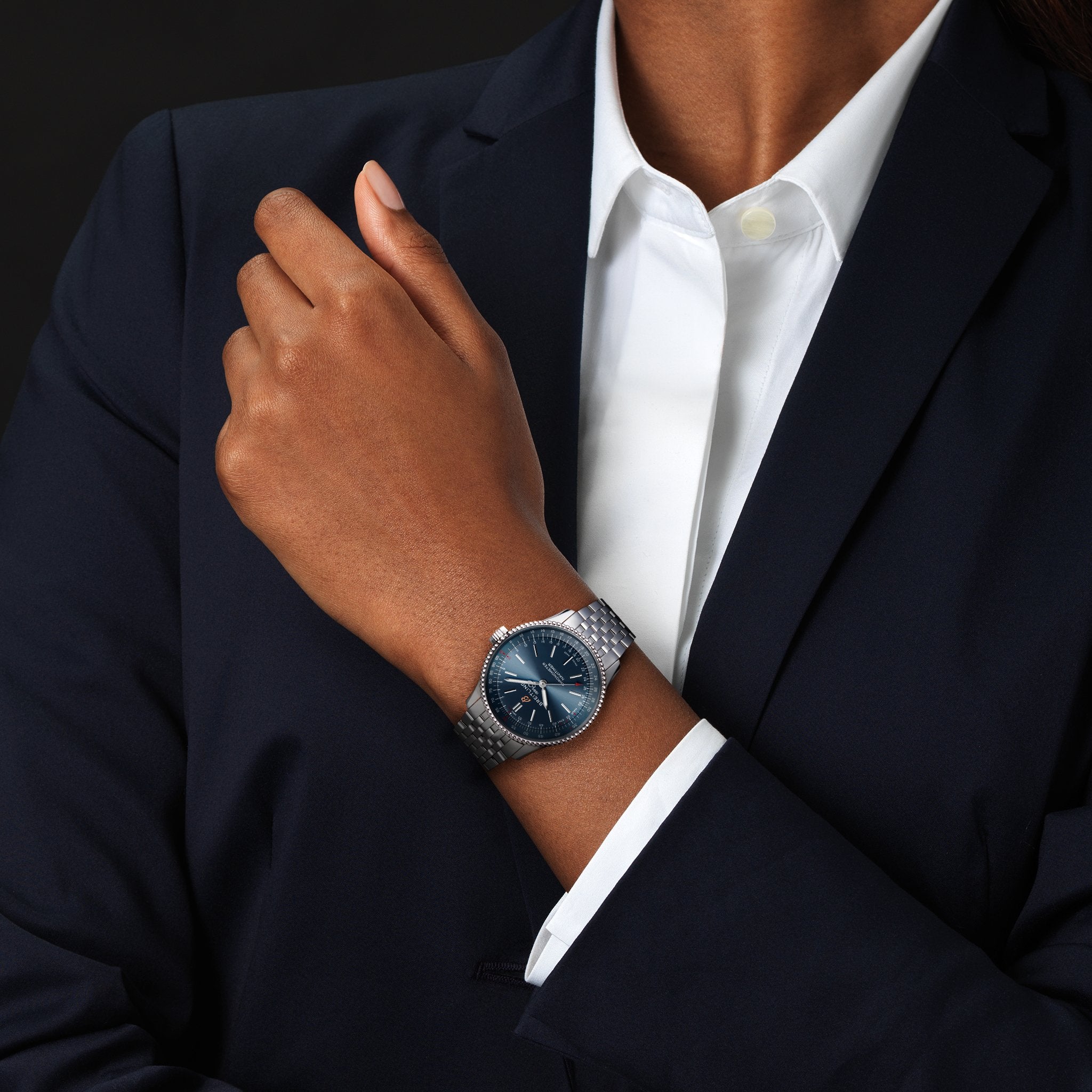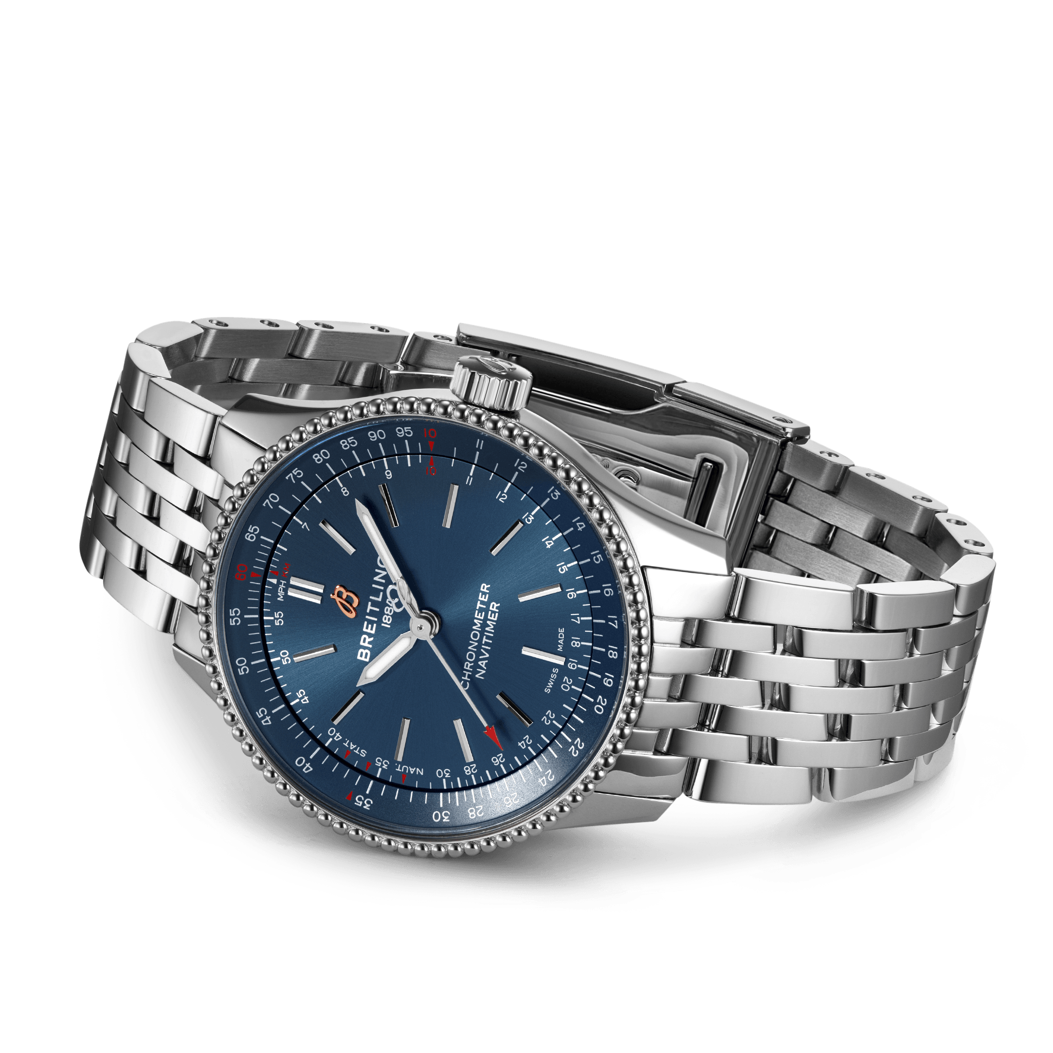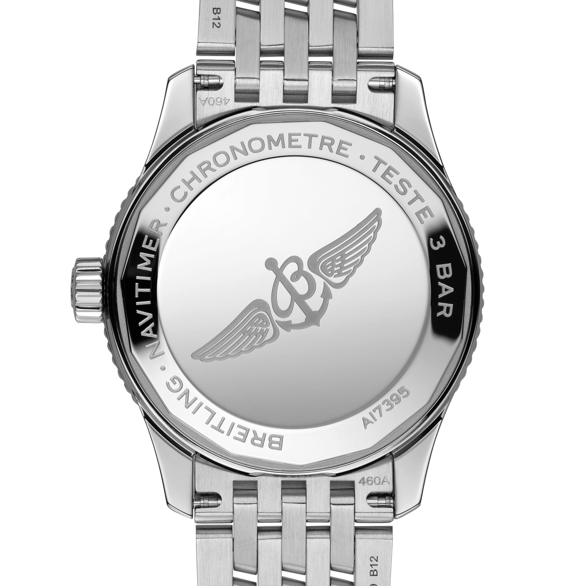Breitling Navitimer Automatic 35 Ladies Watch, 35mm, polished Stainless Steel case, Reference A17395161C1A1. This model has Blue dial with a fine sunray finish and Tachymeter scale on dial flange. Recognizable Rose Gold tone “B” emblem below the 12 o’clock position. Attract attention polished luminous silver-tone hour and minute hands with Red-tipped seconds hand. On dial applied polished index hour markers. On the outer edge of the dial, there is a Navitimer scale with minutes and seconds in small print. The watch has Stainless steel Pull / push non screw-locked crown with a two gaskets. The crown with a ribbed edge for a comfortable grip and from the butt Breitling logo. The dial closed by a Cambered sapphire crystal, glareproofed both sides. The screwed solid case back is made of Stainless Steel. The watch is equipped bidirectional rotating beaded Stainless Steel bezel with slide rule. The watch is self-winding mechanical Breitling in-house caliber 17 contains 25 jewels and has an approximate power reserve of 38 hours. This model presented on a polished Stainless Steel Navitimer bracelet with a Stainless Steel Folding Clasp with Safety Latch. The water resistance is up to 30m/100ft.