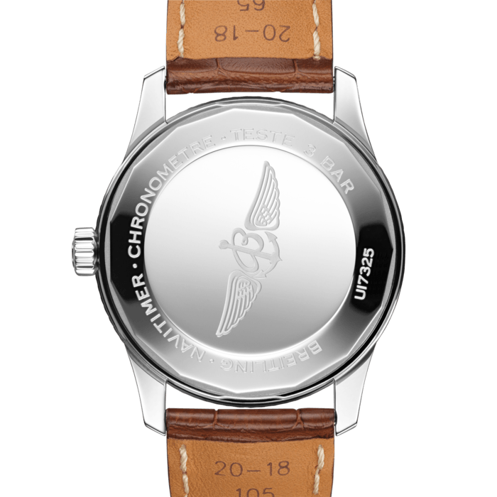 Refined and elegant unworn Breitling Navitimer Automatic 38 watch, case of polished stainless steel and 18k Red Gold , Reference U17325211G1P1. This model has Silver dial with a fine sunray finish and Tachymeter scale on dial flange. On the outer edge of the dial, there is a Navitimer scale with minutes and seconds in small print. The Watch is polished 18k Rose gold hour and minute hands with luminous fill also Red-tipped seconds hand, applied 18k Rose Gold index hour markers. The watch has polished stainless steel non screw-locked crown with two gaskets. The crown has a ribbed edge for a comfortable grip and Breitling logo. The dial closed by a Cambered sapphire crystal, glareproofed both sides. The screwed solid case back is made of Stainless Steel. The watch is equipped bidirectional rotating features a beaded 18k Red Gold bezel with slide rule. The watch is self-winding mechanical Breitling in-house caliber 17 contains 25 jewels and has an approximate power reserve of 38 hours. This model presented on a Brown Alligator /Crocodile Leather strap with a Stainless Steel Tang Buckle Clasp. The water resistance is up to 30m/100ft.